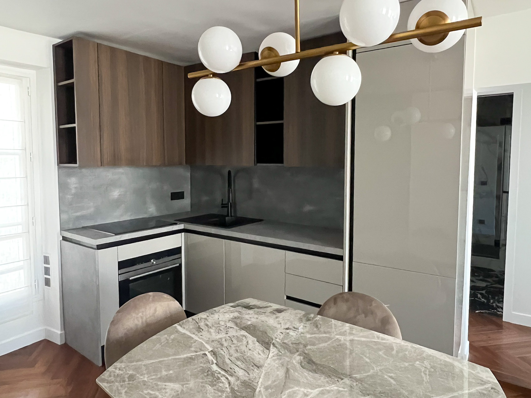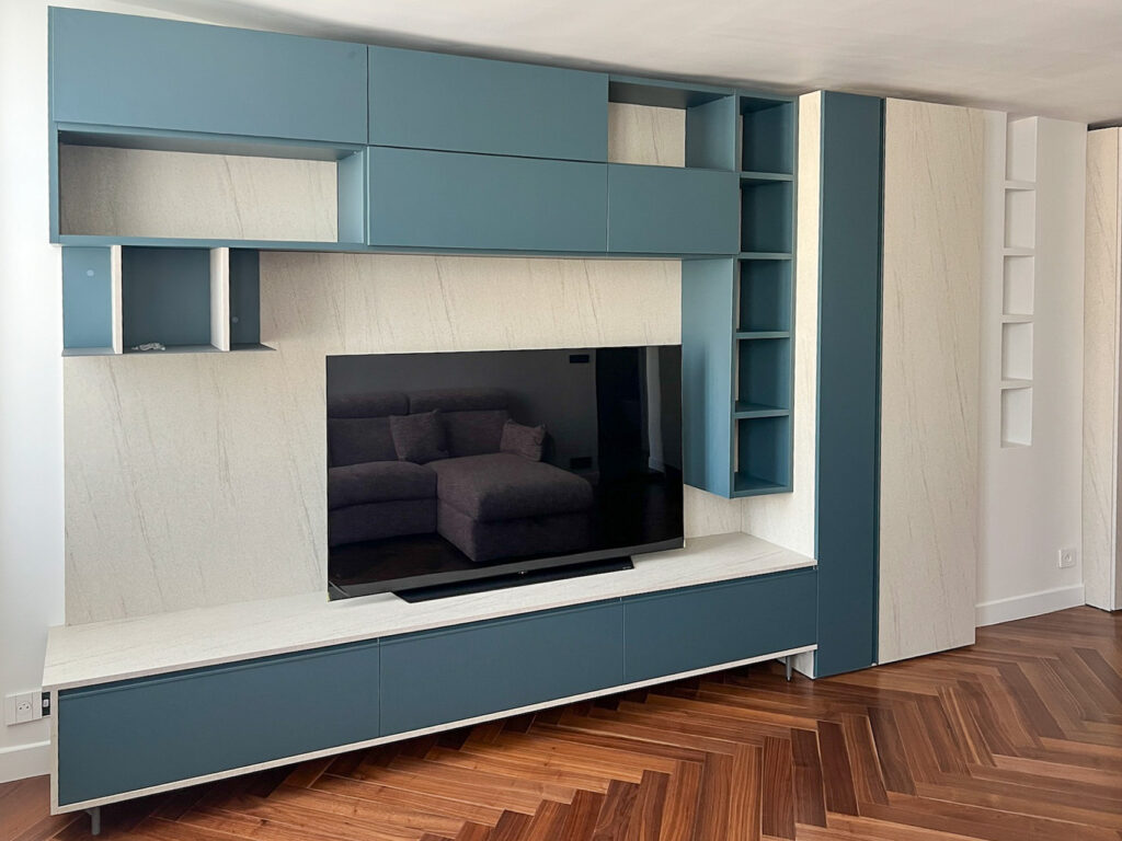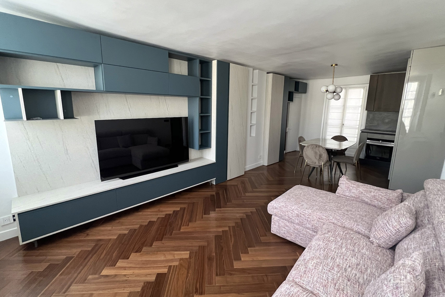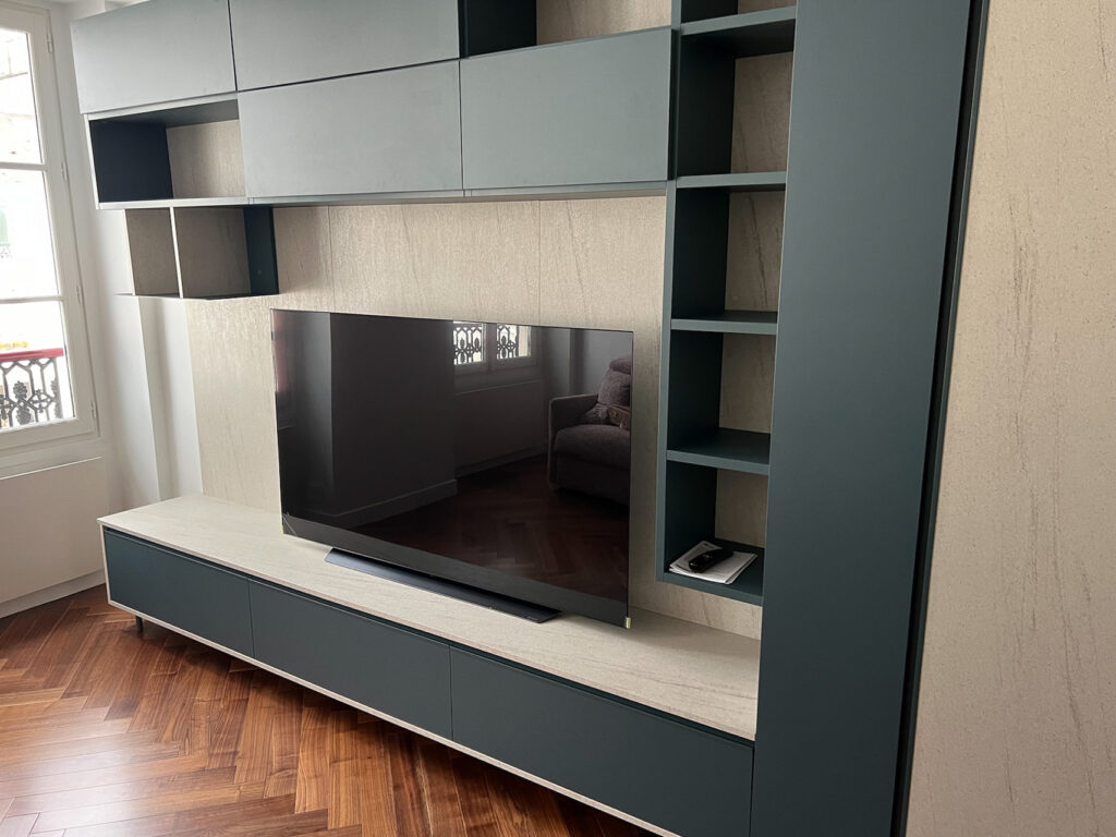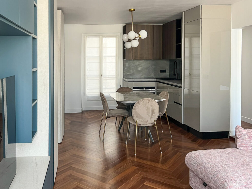 Le cœur du projet a consisté à apporter une vraie personnalité à cet appartement et s’est joué dans les détails d’agencement et le travail d’ajustement avec un niveau de précision rarement nécessaire sur une telle surface.