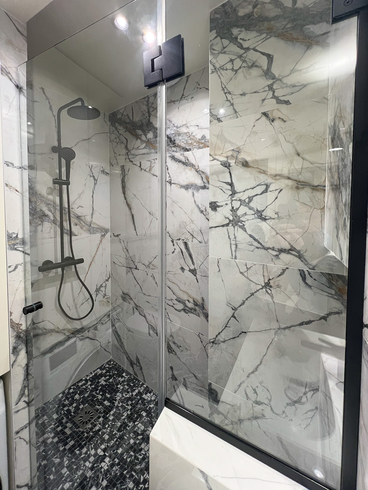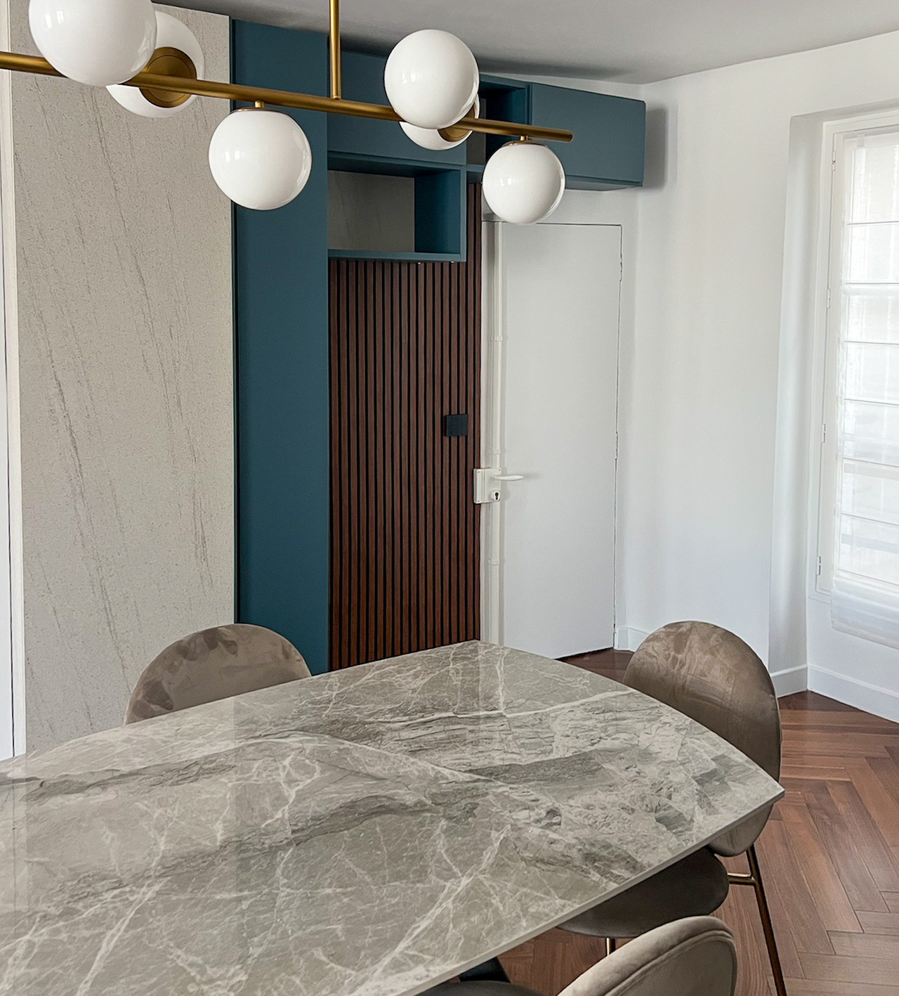 Pendant toute la durée du chantier, seul Ton* s’est déplacé à Paris pour suivre l’avancement. Inn*, elle, a découvert l’appartement une fois les travaux achevés. Ce qu’elle a trouvé a largement dépassé ses attentes. Elle pensait entrer dans un lieu bien rénové ; elle a trouvé un appartement pensé dans les moindres détails, harmonieux, fonctionnel, avec ce petit supplément d’âme que donne le soin porté à l’ajustement et à la matière.