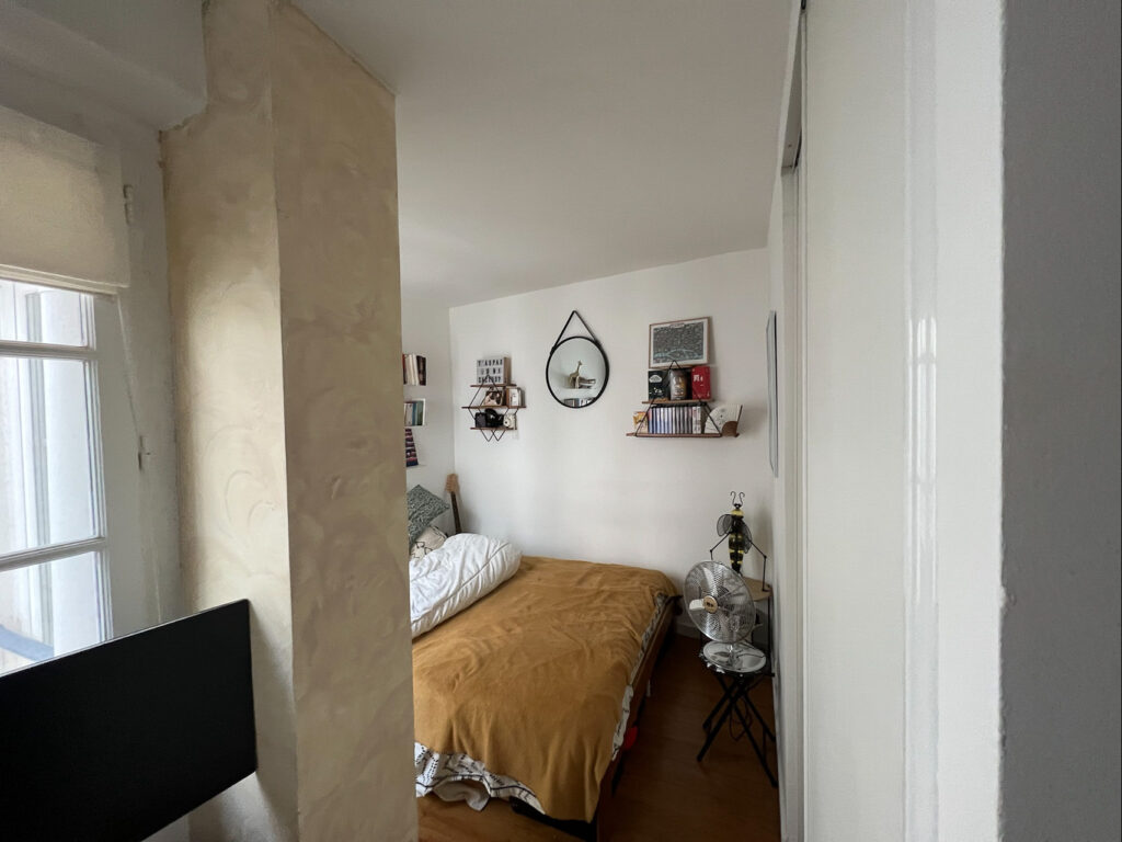 Situé au 4ᵉ étage d’un immeuble ancien à ossature bois, au cœur de la rue Saint-Antoine, l’appartement offrait déjà un cadre de vie agréable, typique du vieux Paris, avec ses particularités : murs de guingois, plafonds inclinés, volumes asymétriques, et une luminosité contrastée entre la large avenue côté salon, et un puits de lumière côté chambres. Avec 55 m² à disposition, il fallait composer avec l’existant pour répondre à un programme familial exigeant, sans bouleverser l’esprit du lieu. Le projet s’est donc structuré autour de deux volets : rénover et ajuster intelligemment, puis intégrer du mobilier haut de gamme avec un haut degré de finition.