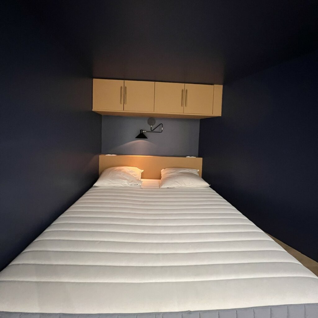 Pour accentuer cette hiérarchie spatiale, nous avons traité toute cette zone nuit dans une couleur profonde, un bleu nuit dense, appliqué sur les murs et le plafond. Ce choix permet d’ancrer visuellement l’estrade dans l’espace, de créer un contraste fort avec les murs blancs environnants, et d’envelopper le lit dans une ambiance feutrée.