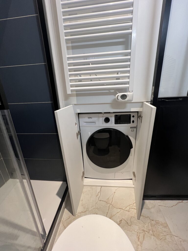 Ce nouveau coin nuit a été posé sur une estrade sur mesure. L’idée était double : créer une scène intime et délimitée dans l’espace, mais aussi profiter de cette surélévation pour intégrer des rangements. Sous le lit, plusieurs tiroirs permettent de stocker du linge ou des objets volumineux. Et surtout, un compartiment traversant a été conçu pour accueillir une machine à laver. Un accès discret, prévu depuis la salle de bain, permet de la charger sans qu’elle n’empiète sur le volume principal.